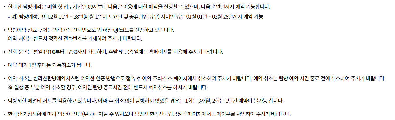 한라산 국립공원 내 일부 구간(성판악, 관음사 코스)은 탐방 예약이 필수입니다.